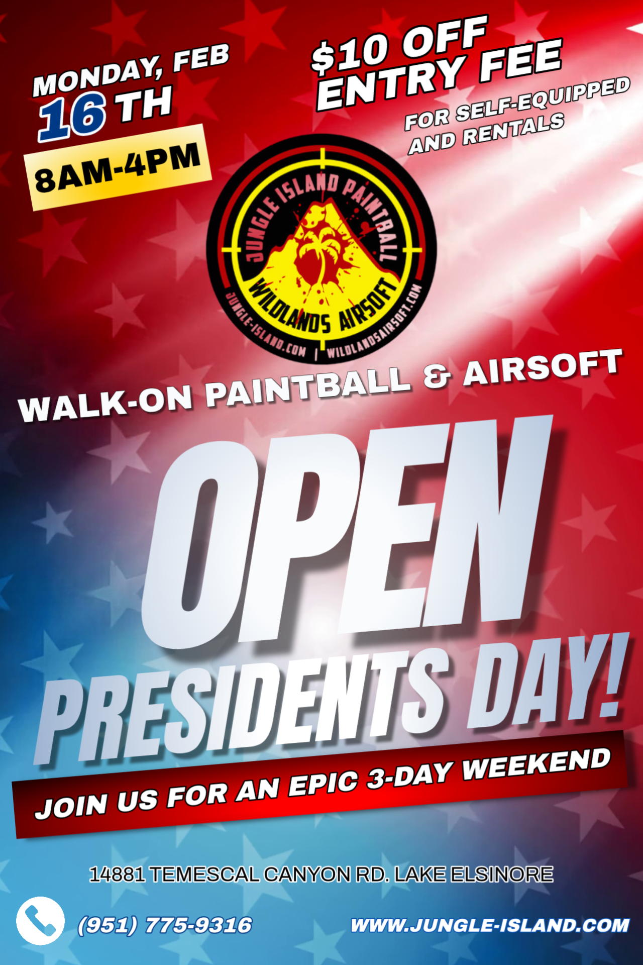 Why settle for a boring Monday when you could be on the field? We’re opening the gates at Jungle Island Paintball & Wildlands Airsoft for a special holiday session to cap off your 3-day weekend!